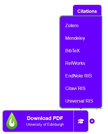 LibKey Nomad is already installed on University open access computers and you can also install the browser extension on your own computer (it's available for several browsers including Google Chrome, Firefox, Edge and Safari). You will have to activate the extension on each browser you use. Check the Library's LibKey Nomad page for more details about how to download and use LibKey Nomad. Once the extension is installed and activated, you'll see the LibKey Nomad logo pop-up across different websites whenever content is available from the University of Edinburgh Library or from open access sources.