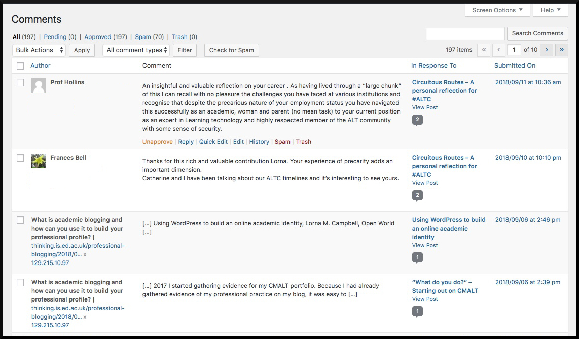 Unmoderated commenting is turned off by default on all blogs hosted on blogs.ed.ac.uk.  In order for a comment to appear on your blog you must approve it first. This means that you are in control of what comments appear on your blog and whether you wish to answer them.  You are not obliged to answer any  comments you receive and you’re entitled to delete comments that are offensive or unhelpful.  You may choose to turn on unmoderated comments if you prefer. blogs.ac.uk also has a variety of spam filters to help filter out spam comments.