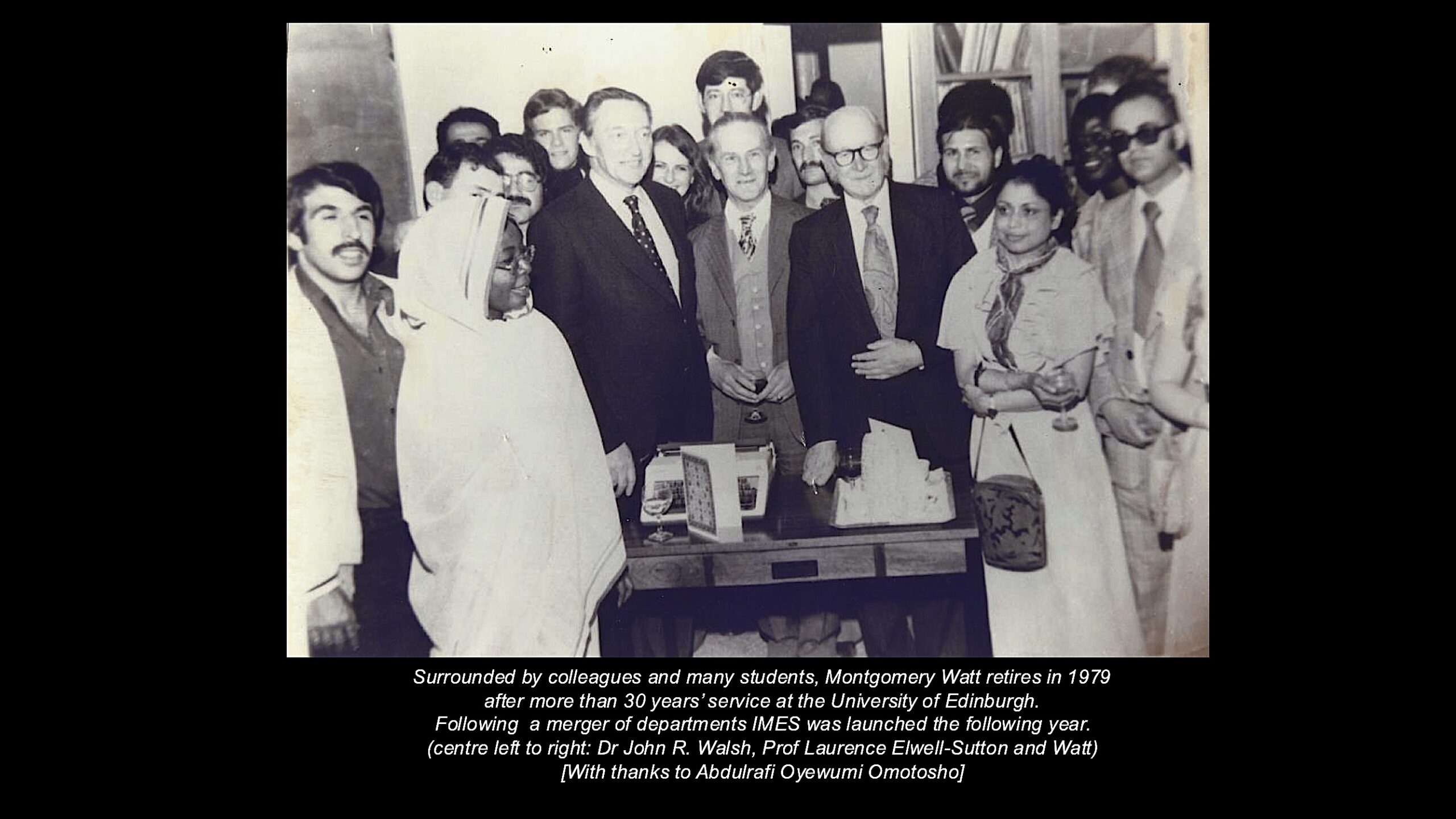 Over the next decades, the University of Edinburgh consolidated its reputation as an internationally recognised centre for the study of Islam and of the Middle East. This was due in no small measure to Montgomery Watt whose international status and sympathetic interpretation of Islam attracted students from around the world, not least the Middle East. Watt remained the dominant figure in Arabic and Islamic Studies at Edinburgh until the end of the 1970s when he retired. His intellectual legacy was one of the reasons why the University of Baghdad donated the sum of £250,000 in 1979 to endow the new Iraq Chair of Arabic and Islamic Studies that would help secure the future of the field at the University. In 1980 the Departments of Arabic and Islamic Studies, Persian and Turkish were merged to form Islamic and Middle Eastern Studies (IMES) which remains the centre of much teaching and research on the Middle East at the University today.