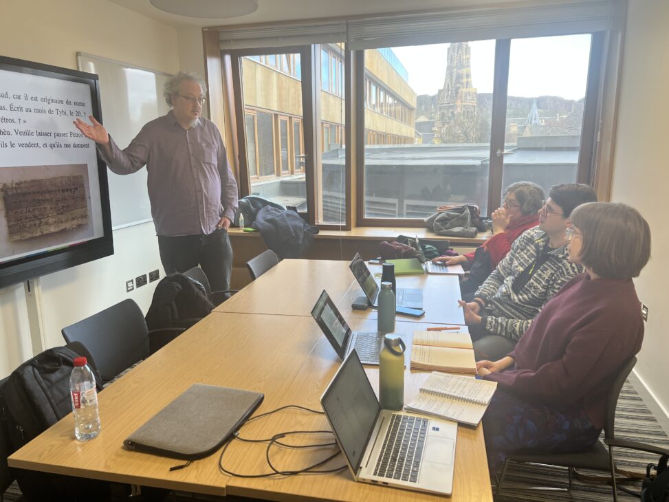 On Thursday 26th and Friday 27th February, the Caliphal Finances team had the joy and privilege of meeting Professor Alain Delattre, Coptic and Greek papyrologist and Dean of the Faculty of Literatures, Translation and Communication at the Université Libre de Bruxelles. Also present were Eline Scheerlinck, who recently left the project and is now a postdoc at Aix-Marseille Université; Sophie Kovarik, who will join the Caliphal Finances team very soon as a postdoc; PhD student Georgi Obatnin; and PI Marie Legendre.