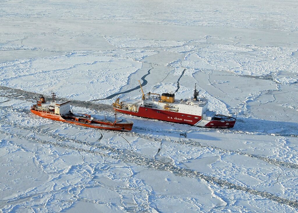 The USCG Healy (WAGB-20) breaks ice around the Russian-flagged tanker Renda 250 miles south of Nome, Alaska, Jan. 6, 2012. The Healy is the Coast Guard’s only currently operating polar icebreaker. (DoD photo by Petty Officer 1st Class Sara Francis, U.S. Coast Guard/Released)