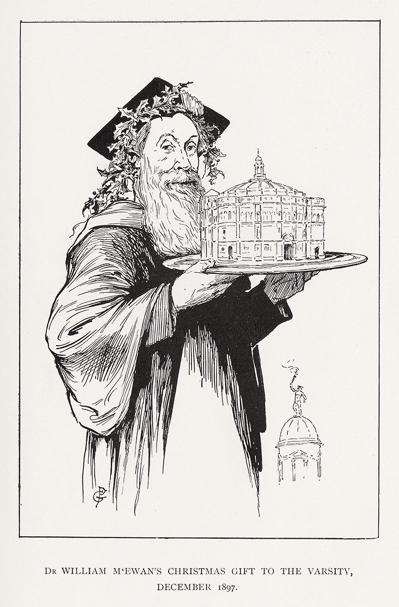 Last month I was asked to take some photos of the McEwan Hall which is currently undergoing a major redevelopment to bring it into the 21st century. Having previously photographed Rowand Anderson’s architectural drawings for the building, I have long been looking for excuse to see inside and was delighted to have this chance. This huge auditorium has a seating capacity of 2000 and was presented to the University in 1897 by the Brewer and Politician William McEwan.  We have a lovely illustration in the collections of a holly festooned McEwan giving the Graduation Hall to the University on a platter, with Old College’s golden boy in the background.