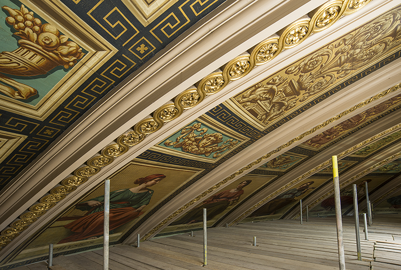 19 miles of scaffolding had been erected in the auditorium to enable the Scottish Wall Painting conservators to clean the stunning murals by William M. Palin, which he had based on the wall paintings at St Pauls. This seemed too good an opportunity to miss: it will be a long time until such close access to the paintings allows us to document these wall paintings again. Additionally, photography of the building undergoing such extensive work adds to the archive we already hold for the Hall.