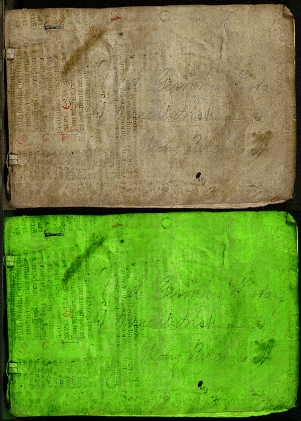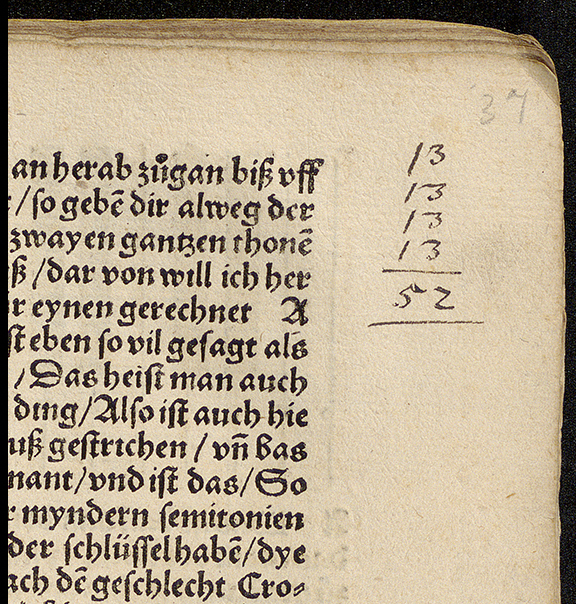 The book is in quarto format, 110 pages including the cover, and has been bound in a vellum manuscript (not the original binding). There has been writing added to the front cover (possibly in the 19th century), “Old German History of Musical Instruments Oblong Parchment”. To decipher the text on the cover I adjusted the colours (slightly radioactive!) in post-processing for ease of readability. Other markings to our text include maths notes, and a child’s scribbles on the first and end pages. It appears that our copy is incomplete, lacking the last few leaves O2, O3, and O4. These missing pages are a continuation of the instruction of recorder fingering that is found in the last section of the book, with a woodcut chart as a visual aid. It’s a shame that the last few pages are lost, but this could have been the reason for the re-binding of the text.