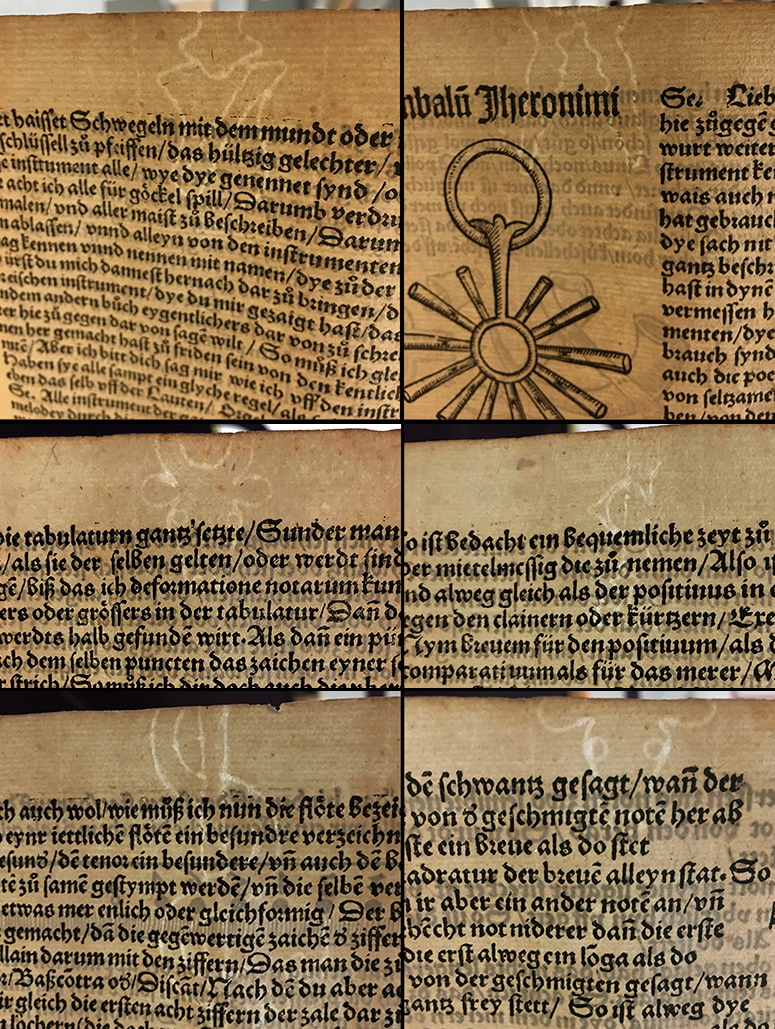 Musica Getutscht includes a woodcut of a lutenist from the eminent Swiss artist, Urs Graf. Most scholars assumed all the woodcuts were illustrated by him on the basis of a single image that bore his signature. The comparative crudeness of the other illustrations however, clearly indicate that there was no connection with Graf’s work. In fact, the printers haven’t done the best job aligning the title page, using various woodblocks to complete a disjointed border around the text.