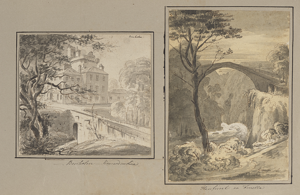 The album’s cultural significance in relation to Sir Walter Scott is certainly important, but from an archival perspective, I can’t help but appreciate this time capsule of records of historic buildings and how they used to look, and comparing the illustrations to changes or losses that have occurred since then. Similar to Glen Finella, one other such example is Linlithgow Palace, missing some of the decorative crenelated tower-tops near the entrance, or were these perhaps simply added as an artistic flourish?