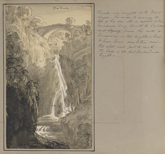 “Finella was daughter of the Earl of Angus. In order to revenge the loss of her son, she is reported to have murdered King Kenneth the 3rd of Scotland and flying from the castle of Kincardine in this neighbourhood to have been overtaken near this spot and put to death. The fall is 63 feet perpendicular height.”