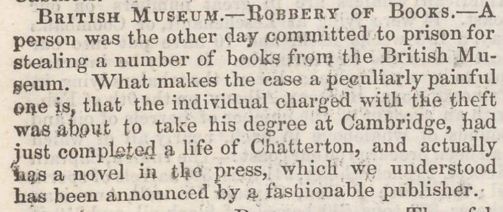 From 1841, this brief snippet describing the robbery of books from the British Museum caught my attention. I did not understand the reference to ’a life of Chatterton’ and endeavored to learn more. As it turns out, this is a reference to the English poet Thomas Chatterton, who is described as a ’precocious poet’ whose life tragically ended at only age 17. Chatterton is credited with influencing the great poets Shelley, Keats, Wordsworth, and Coleridge.