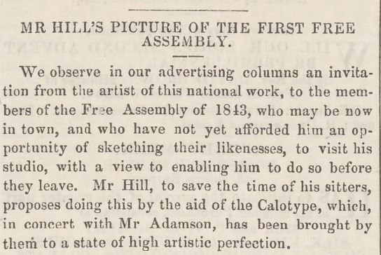A piece of photographic history that caught my eye was this mention of the Edinburgh duo David Octavius Hill and Robert Adamson, who played an important role in the development of the field of early photography. Here, an advert was issued in 1843 for members of the Free Assembly to have their likeness taken to be used as reference for a painting that David Hill was working on. This is thought to be the first painting created with the assistance of photography. You can find more information on the final painting here and some of the photographs taken by Hill and Adamson in the University’s collections.