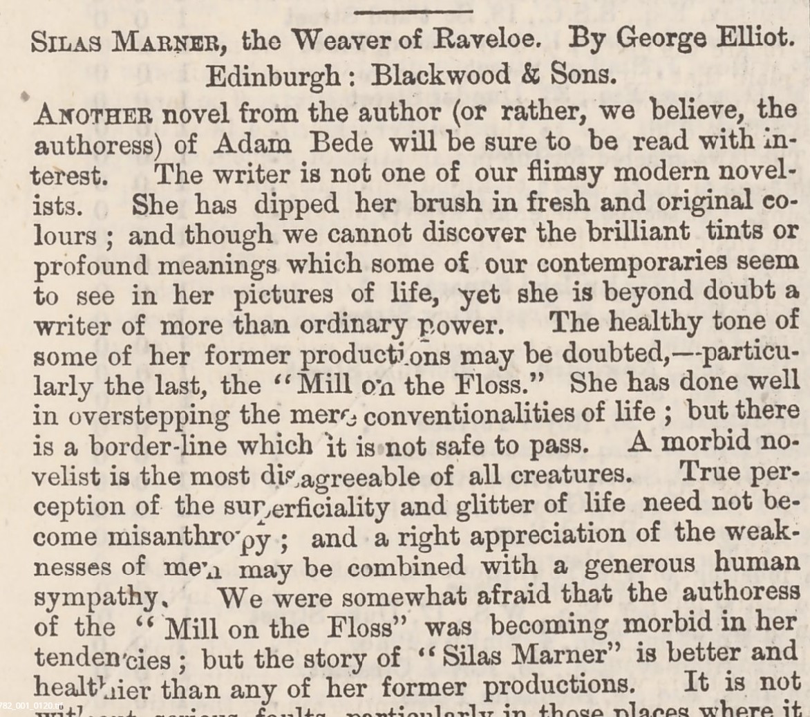 And lastly, from 1861, here is a snippet of a review of ’Silas Marner’ one of the seminal works of English author George Eliot. The writer of this review correctly deduces that Eliot is in fact a woman and provides the endlessly amusing assertion that ’A morbid novelist is the most disagreeable of all creatures.’