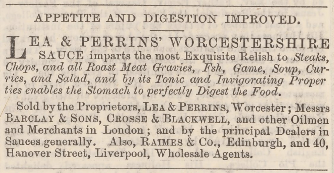 From 1856, I was delighted to find this advertisement for the famous Lea & Perrin’s Worcestershire Sauce. I was very intrigued to see the claim that the sauce could improve appetite and digestion!