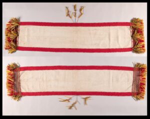 White and red cloth usually worn around the waist by young women. The fabric is made of two panels of woven white cotton, with a red band along each edge. At either end a complex pattern in red and black has been worked in. An elaborate fringe of tasselled yellow orchid stem and coloured braids has been attached at top and bottom. This cloth belonged to Gaidinliu and was collected by J.P. Mills at Kambiron village in February 1932.