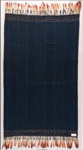 Dark blue woman’s body cloth made from two panels of woven indigo-dyed cotton, with two fringes of faded red-dyed goat hair tassels bound with yellow orchid stem. This cloth belonged to Gaidinliu.
