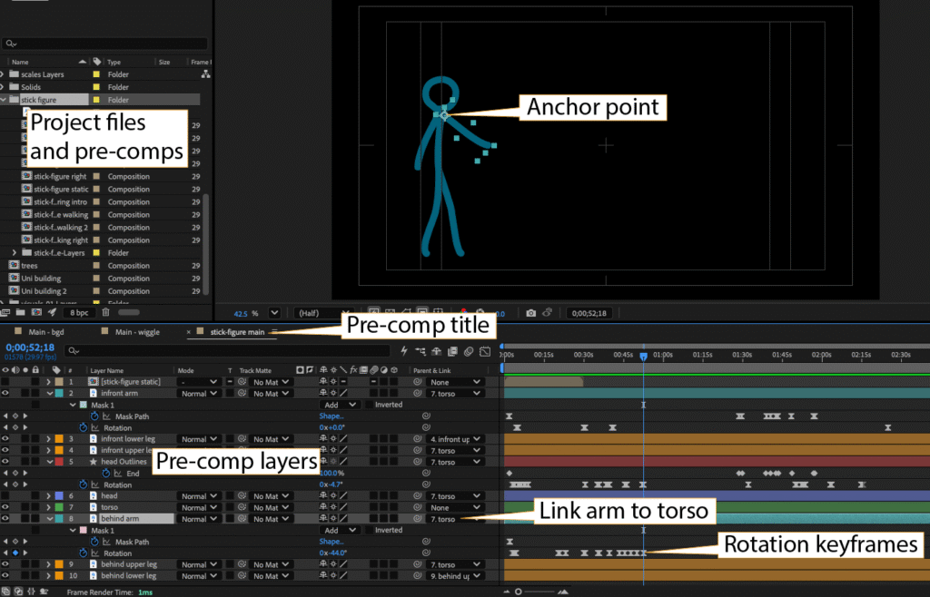 - This video was great for how to make the figure move, using the anchor points and parent linking in After Effects: A simple way to illustrate and Animate Characters | After Effects + ProCreate.