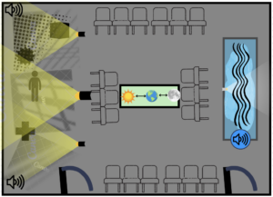 - Auditory: The distance data is sent to Max/MSP, which processes it and plays the sound through the stereo speakers.