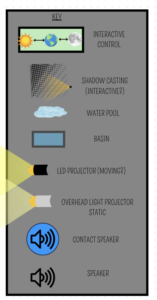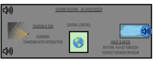 In our soundscape design, the speed and complexity of wave movement–along with other environmental elements–are closely tied to tidal forces. We aim to create a dynamic feedback system where audiences can manipulate the positions of the Sun and Moon, causing changes in tidal force intensity. As a result, the density, layering, and richness of wave sounds and ambient effects will shift accordingly, vividly illustrating the impact of tidal forces.