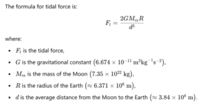 So in the interactive component, we want to first calculate the tidal forces generated by the audience’s adjustments to the positions of the Sun and Moon. The tidal force is determined using the following formula: