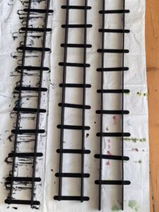 We had been told by the others that the tracks would need some type of system to slow down the trains. They were worried that the audience would want to move the trains extremely quickly, which would then cause a small delay to the data. We decided we would use wooden sticks and then secure the foam board sides to the sticks so the tracks would be separate, and thus easy to transport, but also create sort of speed-bumps for the trains.