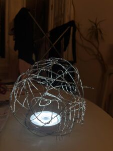 Yanis focused on the metal moon, using a balloon as a template to bend the metal wire to a spherical shape. He made it quite abstract and added small dangly parts.