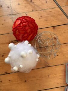 Originally our idea was to use the red wool we had bought to create squiggly shapes over the base sphere, and we were going to glue this down so the wool would be stiff and hold its shape. We started this process and quite quickly realised it didn’t work that well, and kept falling out of place as the glue wasn’t strong enough. We tried multiple different methods like completely dousing the wool in the glue and using super glue to glue parts of the wool together, but nothing worked so we decided to revisit it once what we had managed to do, had completely dried.
