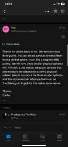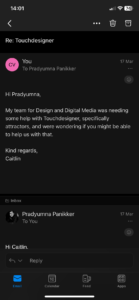 At some point while following the tutorial, it started not working anymore. I kept going back, retracing my steps, and even started again, but it kept breaking. So I reached out to Pradyumna for any help he could offer, as the tutorial I was following still wasn’t exactly what we needed. I explained our project to him and what we needed Touchdesigner for, and he suggested following the same tutorial I was already following. So it confirmed my suspicion that it would quite hard and specific to achieve what we wanted.