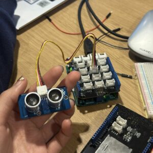 For this purpose, we chose to use an ultrasonic sensor at the beginning of the project, which transmits and receives ultrasound waves to obtain the distance between the two devices. We borrowed the Grove Arduino kit and looked up the tutorials for connecting and using it on the official Grove website. After plugging the ultrasonic sensor(Grove – Ultrasonic Ranger) into the main control board and connecting it to the computer, data reading was successfully achieved. Test results show that the sensor performs well in terms of measurement sensitivity and accuracy, and can meet our needs for real-time distance change perception.