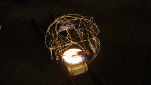 We blocked most of the light with black curtains to create a quiet, immersive universe. Four planets are arranged in a triangle around a central star, guiding the audience into the space. Each planet has its own texture—twisted wire for metal, chunky wool for lava, light cotton for gas, and a handmade Earth-like center.