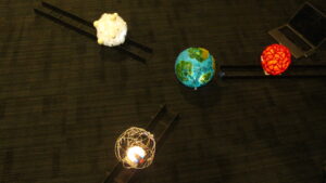 The orbiting planets sit on 3D-printed trains and tracks, and visitors can pull handles to move them, becoming a tidal force in the universe.