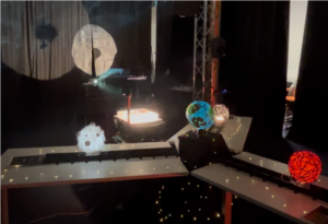 Having explored this research and discussed these and other installations and works as a group, we formulated a plan: to create an interactive installation where the audience can engage with universal forces, altering the visuals, music, and soundscapes around them as the tidal forces change. We would need movement sensors, objects or sculptures for the audience to interact with, and a MAX patch to generate the atmosphere with music and visuals in response to the data. We set about making a fictional planetary system. A central water-based planet, with three moons in orbit, the distance of each to the centre we could measure using infra-red distance sensors.