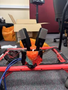 Another issue was that the dog heads couldn’t be mounted directly onto a mic stand. So, we borrowed a speaker stand tray from the music store and used it to support the dog head models. This worked really well, keeping everything stable and secure during the recording.