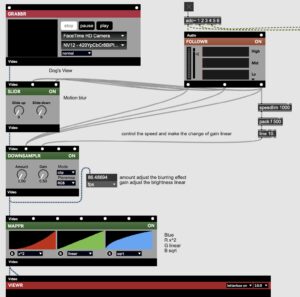 In addition, each video corresponds to a different microphone. I input the sound into different modules to influence the changes in the video, making the auditory stimulation to the audience more visual. Then I also did a simple mix by MAX to enable it to adjust the frequency of the real-time sound. Additionally, I added the reverb and distortion effects to make the ambience heard by the audience closer to the hearing of a dog.