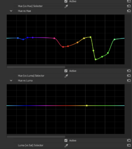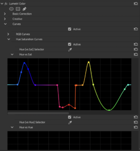 In the Curves Panel, utilize the Hue vs Saturation Curve: