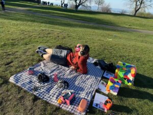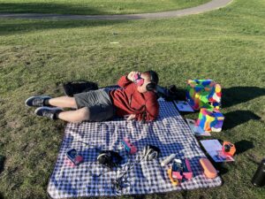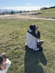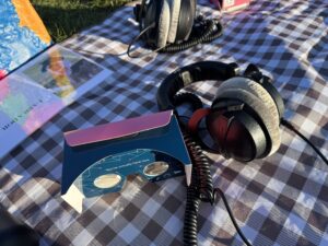 The first section focused on the auditory differences between large and small dogs. We set this part up on the grass, where we laid out a picnic blanket so participants could choose to sit or lie down—bringing their physical perspective closer to that of a dog. To enhance immersion, we also placed real props—the same balls and dog toys shown in the video—on the lawn. This allowed participants to see the objects from both a dog’s perspective (in VR) and their own, deepening the contrast between the two and reinforcing the immersive effect.