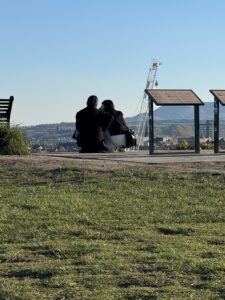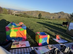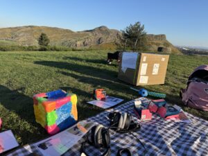 The second section took place near the edge of the hill, where participants had a clear view of Arthur’s Seat and the surrounding landscape. The scenery was stunning, and we found that the natural beauty of the environment made the contrast with the “sensory impairment” content (blind/deaf dogs) even more striking and poignant.