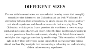 The first part explores the auditory differences between large and small dogs, comparing how they perceive spatial sound and frequency sensitivity within the same environment, highlighting how body size can affect hearing.