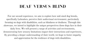 The second part focuses on the auditory perception differences between blind and deaf dogs, using specially designed soundscapes to simulate how sensory loss might lead to compensation or disorientation in their hearing experience.