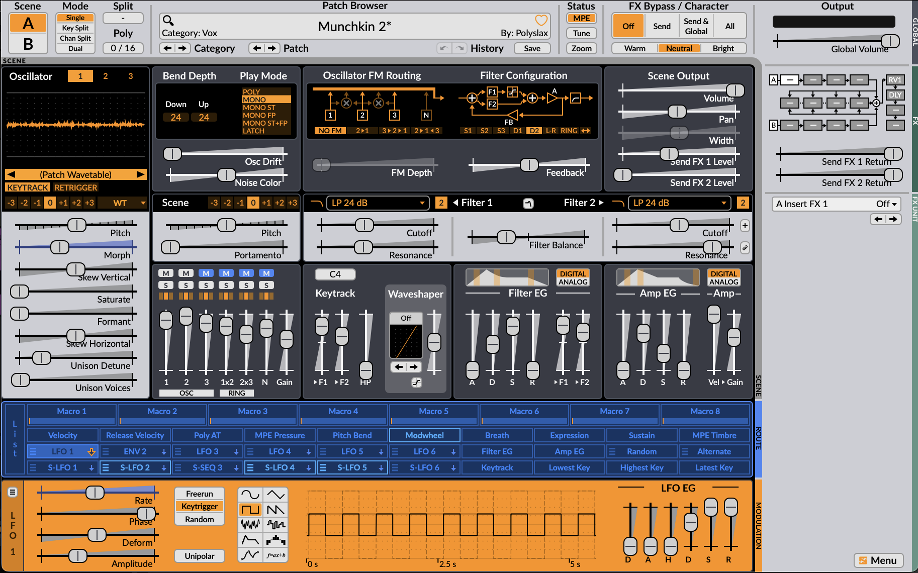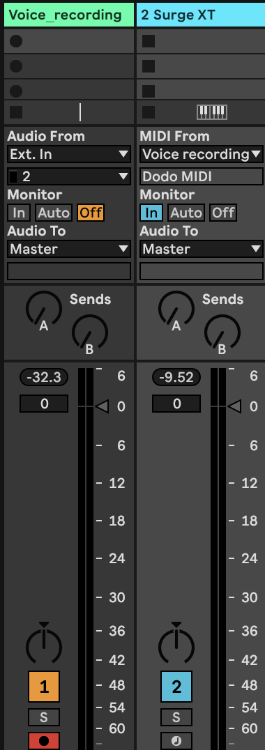 The MIDI track has as input the Voice recording which sends the signal through the Dodo MIDI Plug-In.