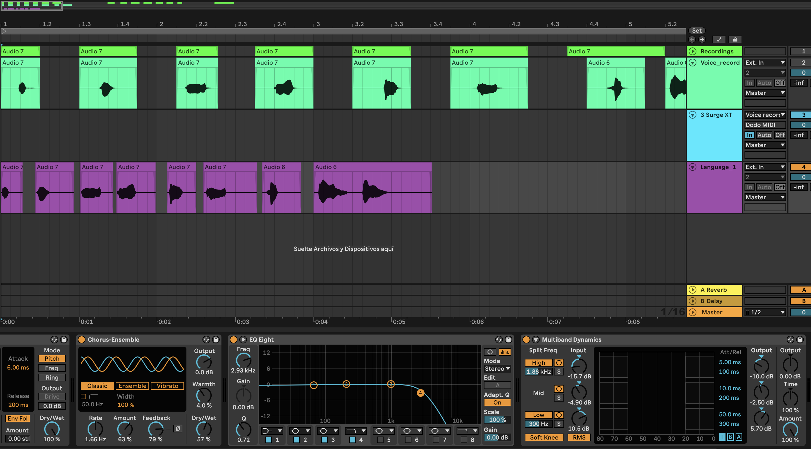 For the character NN, I had to add some extra effects for the “muffled” texture. A Chorus helped to add the unique perspective of the character, the EQ  had a Low Pass Filter to reduce the perception of the vocals and the Multiband compressor reduced the main frequencies (high and medium) and increased the lower.