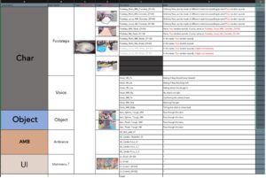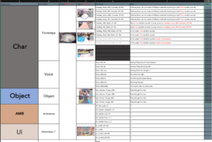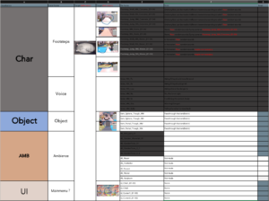 在开始声音制作之前,我们列出了所需声音的详细清单,并按角色、物体、环境声音 (AMB) 和用户界面进行分类。