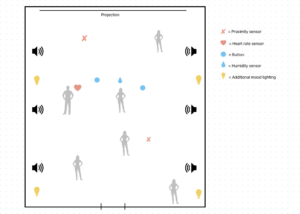 There will be multiple (at least 5) sensors, such as a heartbeat sensor, buttons, knobs, light sensors, and proximity sensors. These will be placed around the centre of the room, for the visitors to interact with. The sensors will be built with Arduino, which will feed the data into Touch Designer to control the main audio ambience, additional SFX and the visual design.