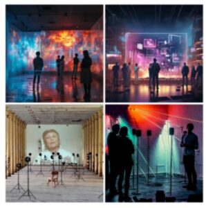 1 room – 5-8 speakers – visual projection. Creating an interactive space where the collective emotions and active presence (of the people in the room) are artistically expressed by audio-visual representation. This is generated by the visitors themselves, with the use of interactive devices around the room.