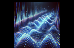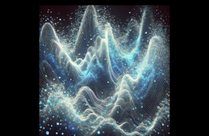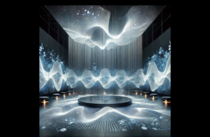 A futuristic sound visualisation representing breath-driven audio feedback. Flowing waveforms create variations based on breathing rhythms, enhancing immersion and combining with Max MSP, Ableton Live or other sound synthesis tools for dynamic sound effects.