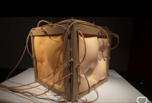 Immersive interactive installation with projection mapping and dynamic light changes. The viewer’s breath affects the flow of light and shadow on the walls and floor, while the hanging structure of the installation oscillates slightly in response to the air flow. The experience is meditative and immersive, perfect for the theme of ‘breathing’.