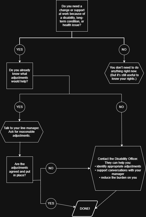 Ask for reasonable adjustments.Best case, that’s all you need. - If adjustments are agreed, they should be implemented and reviewed, not treated as a one-off favour.