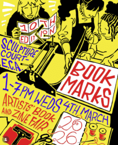 Coming up in March, Wednesday 4th, will be the 10th annual ECA Bookmarks Bookfair at ECA Sculpture Court, another fantastic opportunity to buy artists’ books, zines and prints from ECA students and artists from further afield.