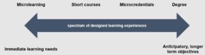 The scenario the group I was in was asked to discuss the challenge of providing learners with a ‘portable skills wallet that they could retain for life’. This didn’t feel very “future” to me as open digital badges is something we’ve offered for a number of years through the BadgEd service, but it was still an interesting discussion to get other perspectives and hear similarities across organisations. The group I was in included representatives from the University of Glasgow and the Botanics and we had a good chat about where we each were on our ‘non-traditional’ journey and in particular how we were similarly supporting a range of learning needs, from the immediate microlearning up to degree programmes preparing learners for longer term objectives. This range is illustrated in this simple image below taken from Matt’s slides.