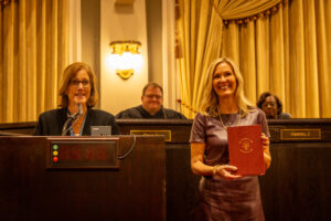 Dean Madeleine Landrieu of Loyola New Orleans College of Law is at the podium with Professor Monica Hof Wallace (also of Loyola) holding the volume being presented to the Louisiana Supreme Court.