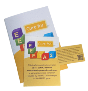 We finally ran the conference in March of 2024. Over a hundred people registered for the live event. This may not sound like many, but it corresponds to about a third of the total target audience worldwide. Considering how many people couldn’t attend because of timing or language issues, we took this as a win! People who registered in advance were sent a little conference pack consisting of an EEF1A2-branded notebook and pin badge; a leaflet about the disorder; a credit card sized information card with a brief description of EEF1A2 and a QR code linking to our website.