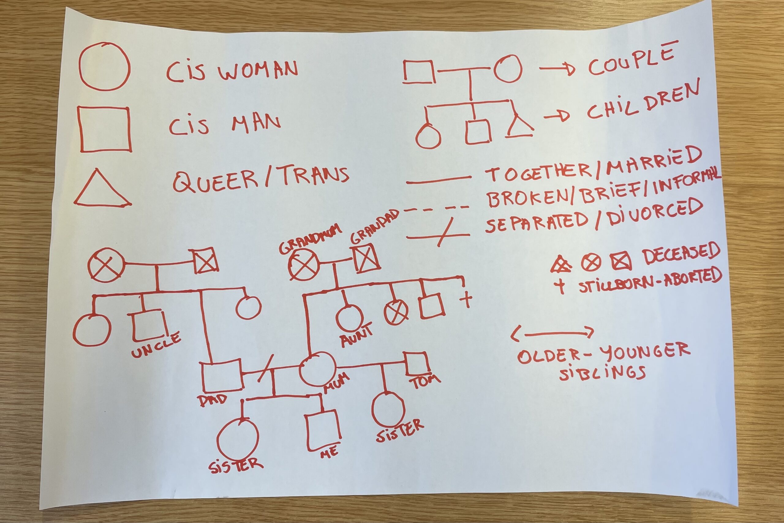 - Second, we held a group discussion about the experience of producing these genograms and the ideas or themes emerging from them.