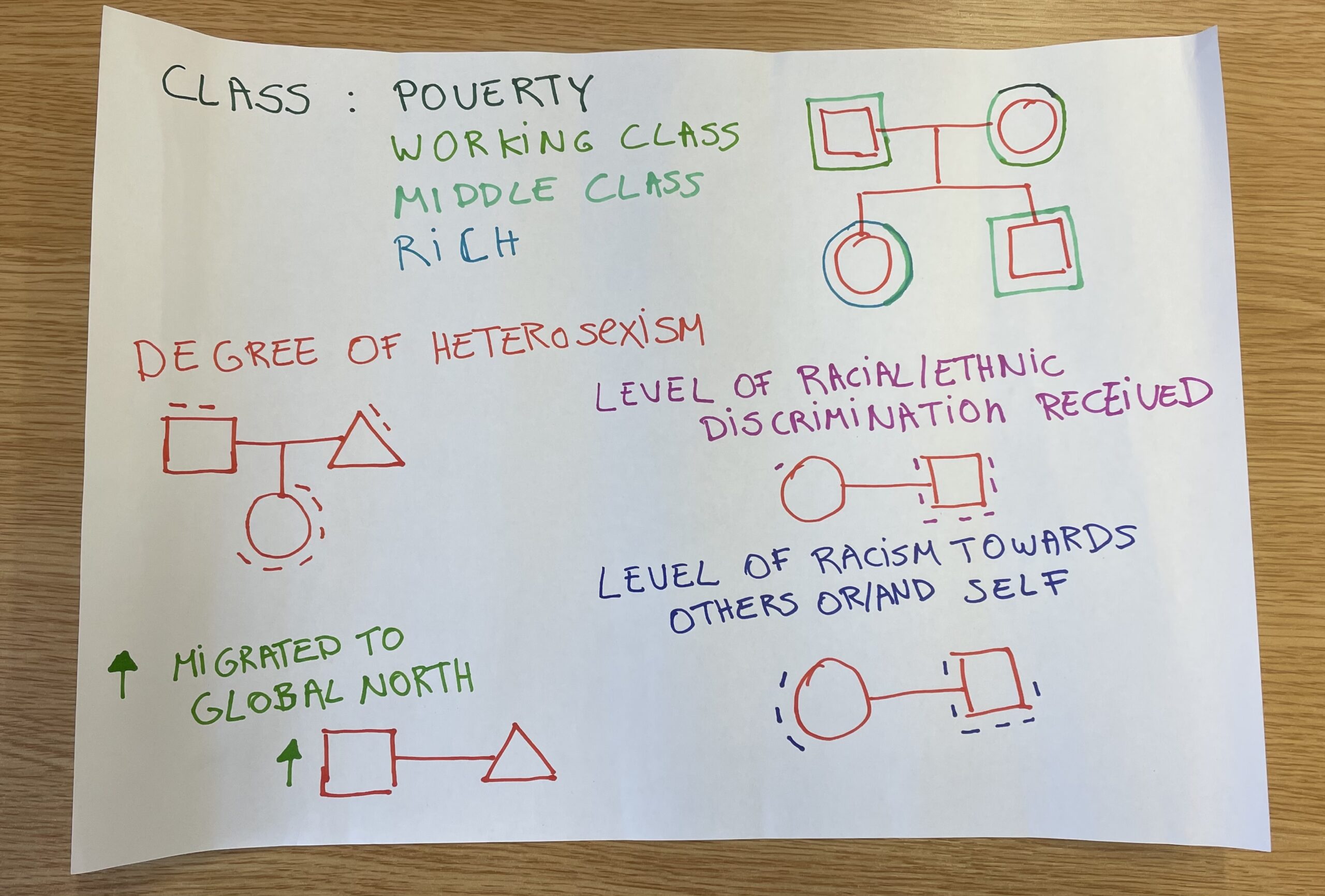 The images below show the instructions we offered for the creation of a critical genogram through various layers: familial relationships, class, attitudes towards sexuality, level of racial/ethnic discrimination received, level of racism towards others and/or oneself, and migration journeys.